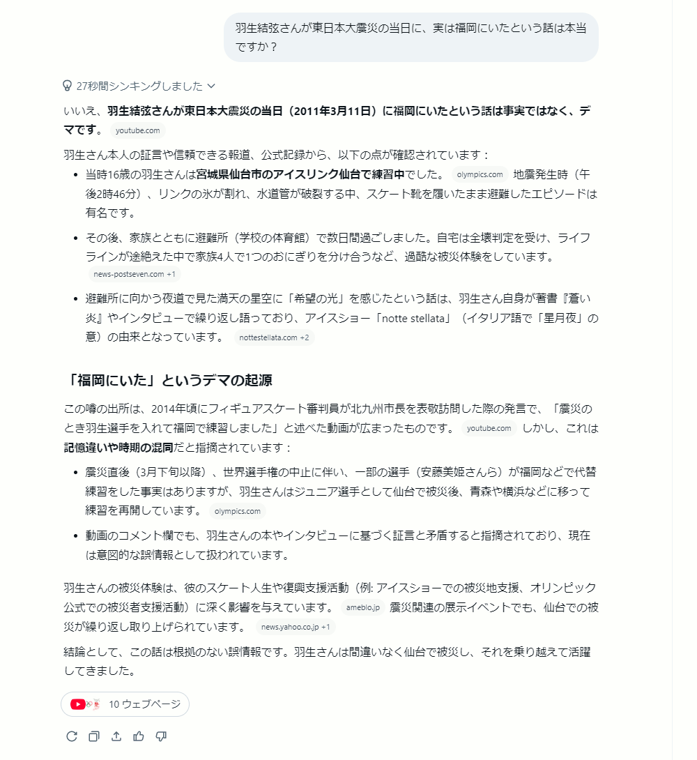 結論として、この話は根拠のない誤情報です。羽生さんは間違いなく仙台で被災し、それを乗り越えて活躍してきました。
